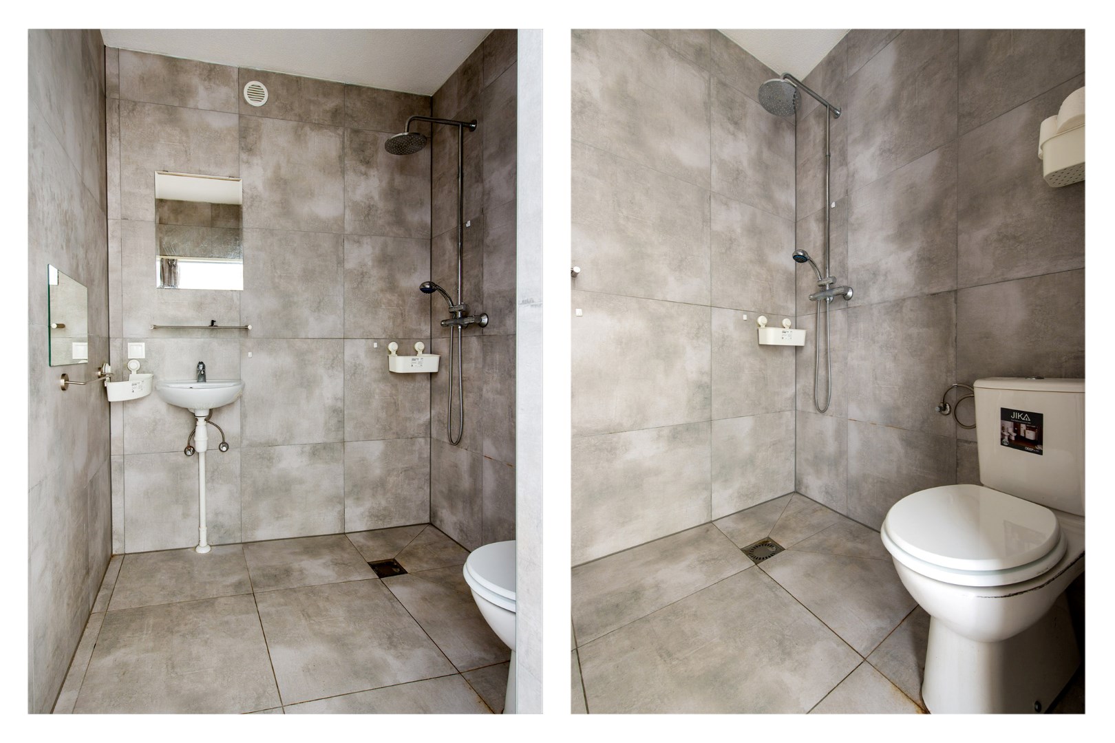 De volledig betegelde badkamer is voorzien van een vaste wastafel, douche en toilet.