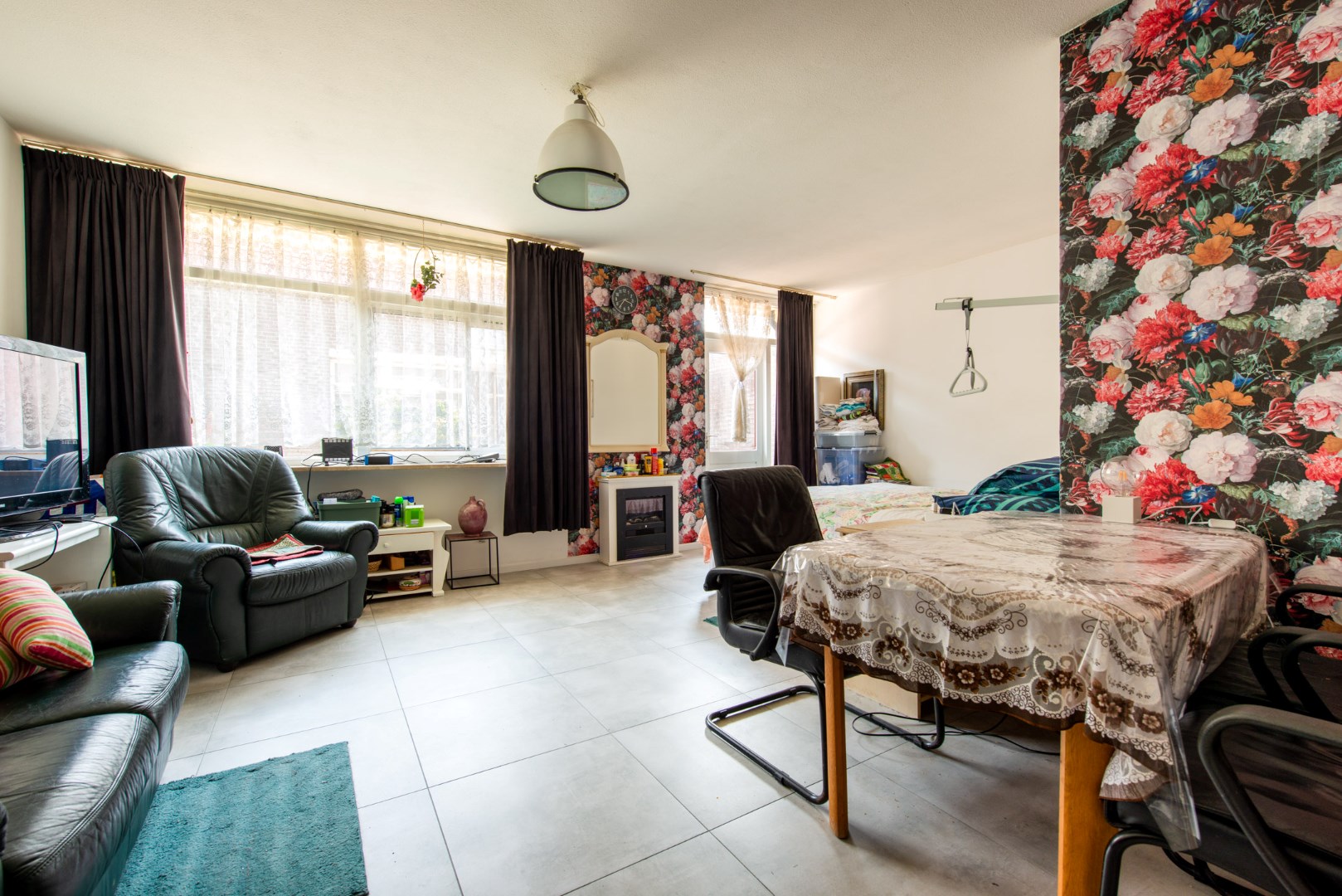 De woonkamer biedt voldoende ruimte voor een eettafel en een zitruimte. In de kamer is een elektrische kachel aanwezig die voldoende is om de hele woning te verwarmen.