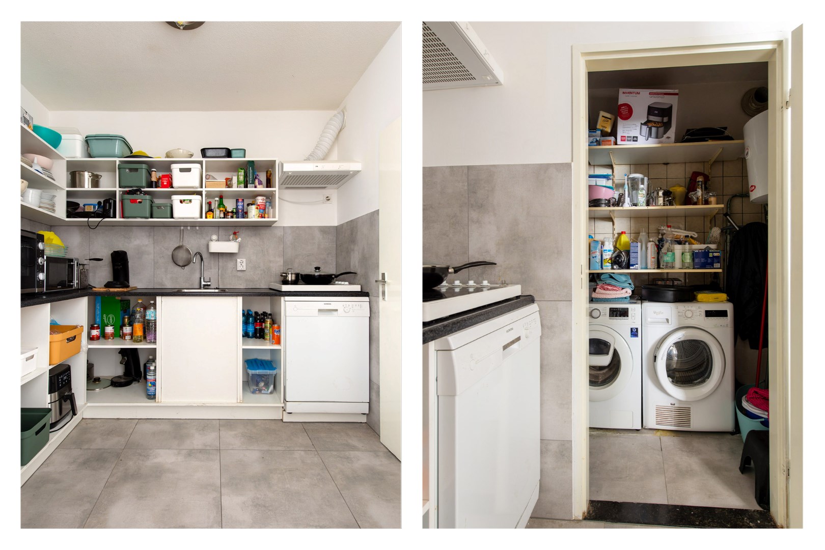 Via de keuken komt u in de aangrenzende bijkeuken waar de boiler hangt en waar de aansluitingen zijn voor de wasmachine en de droger.