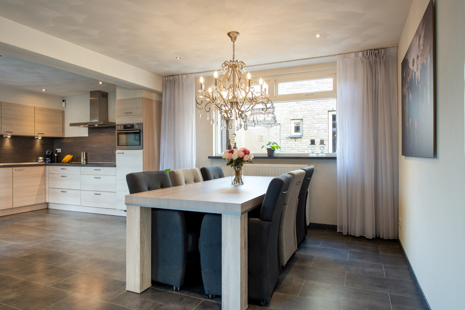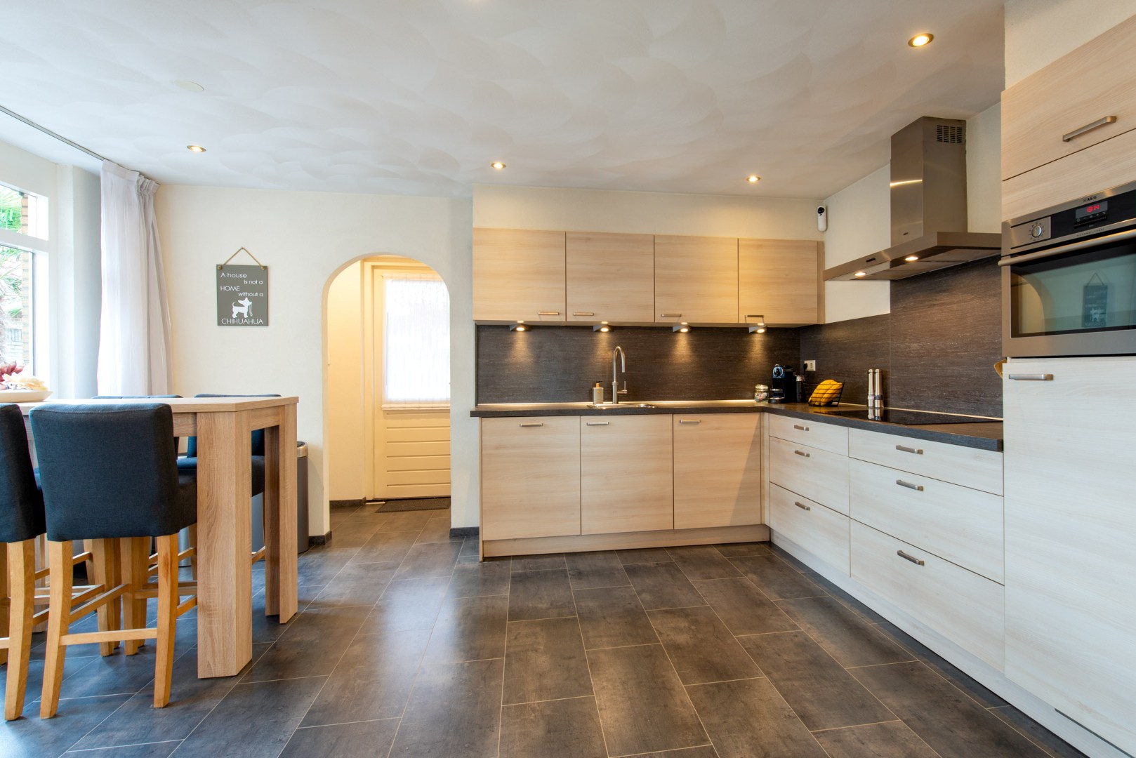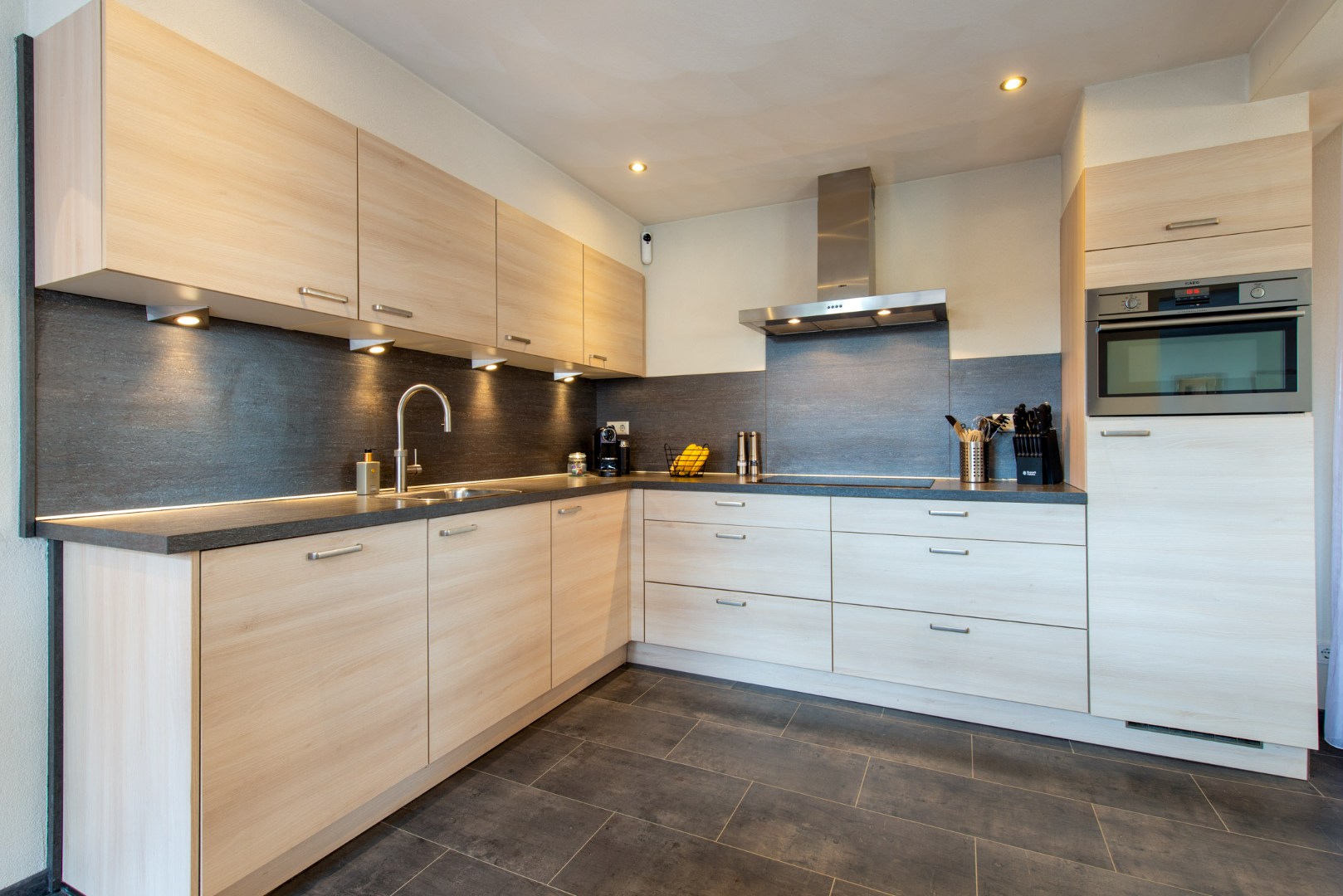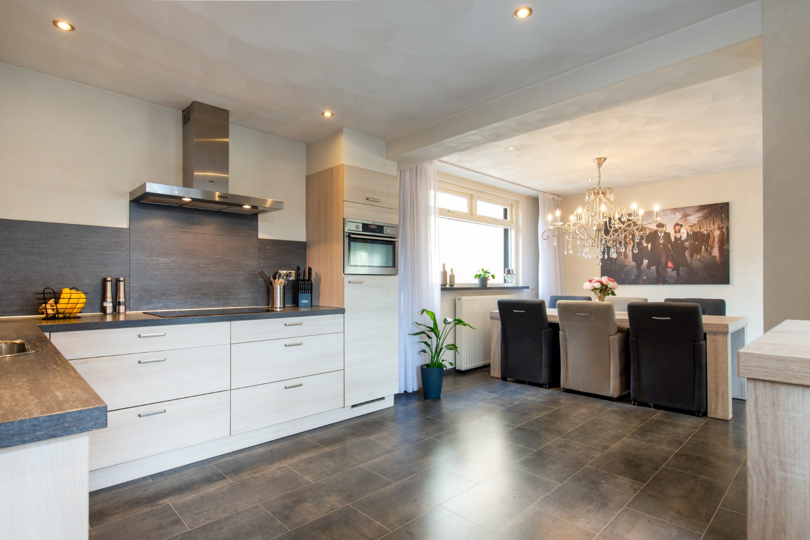 De moderne keuken (2016) sluit hier naadloos op aan. Met haar eigentijdse uitstraling, hoogwaardige inbouwapparatuur en verzorgde afwerking nodigt deze ruimte uit tot koken en genieten – waarbij het daglicht rijkelijk naar binnen valt.
