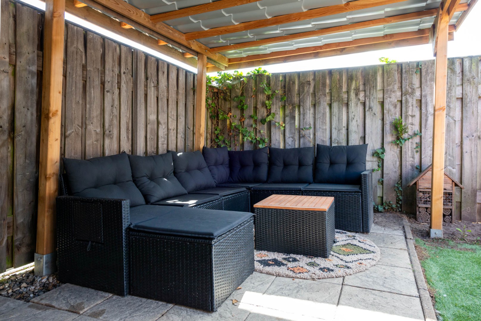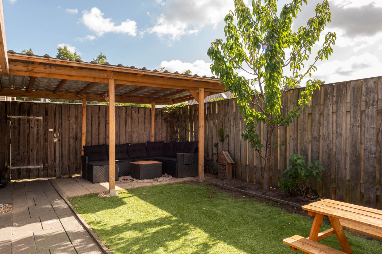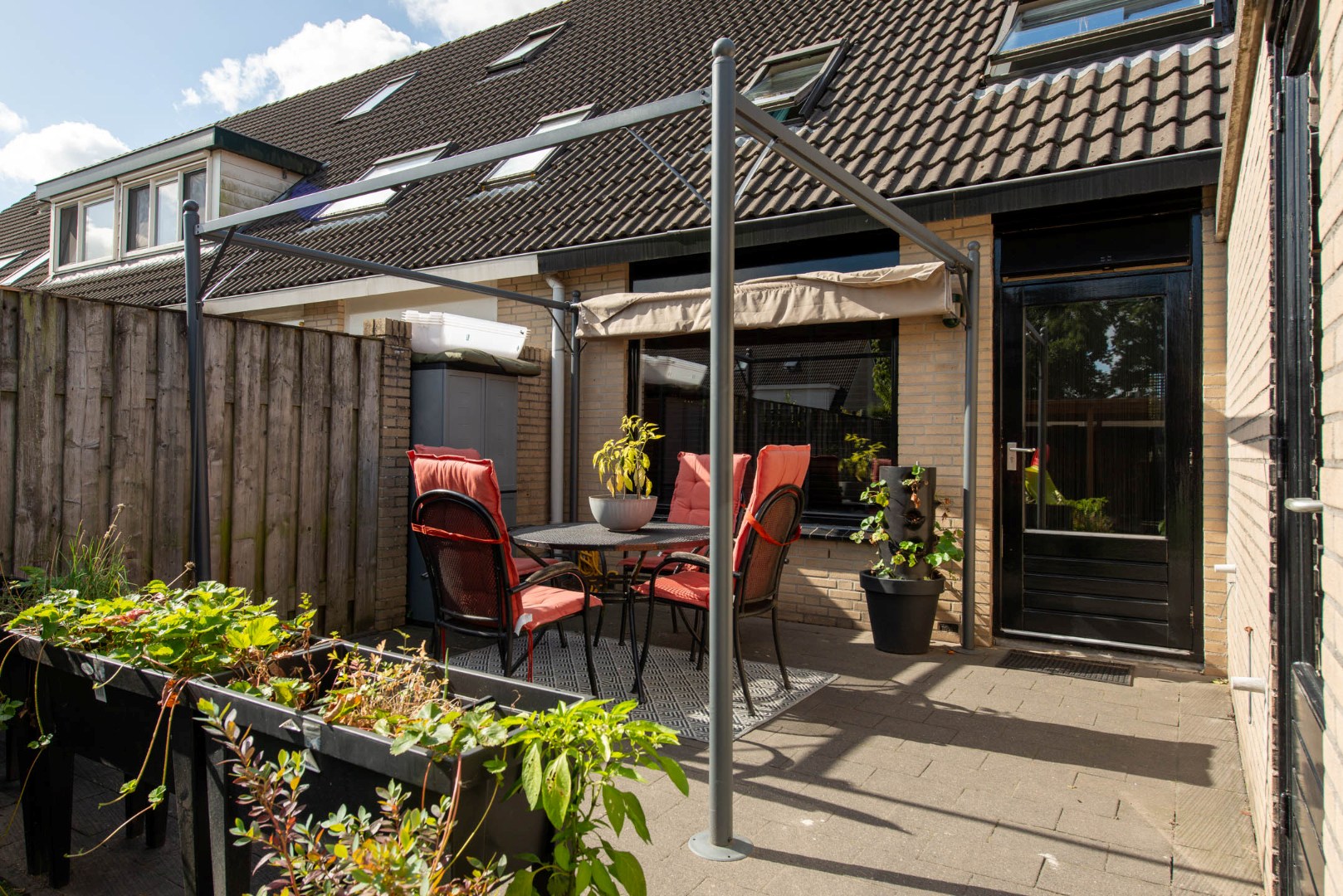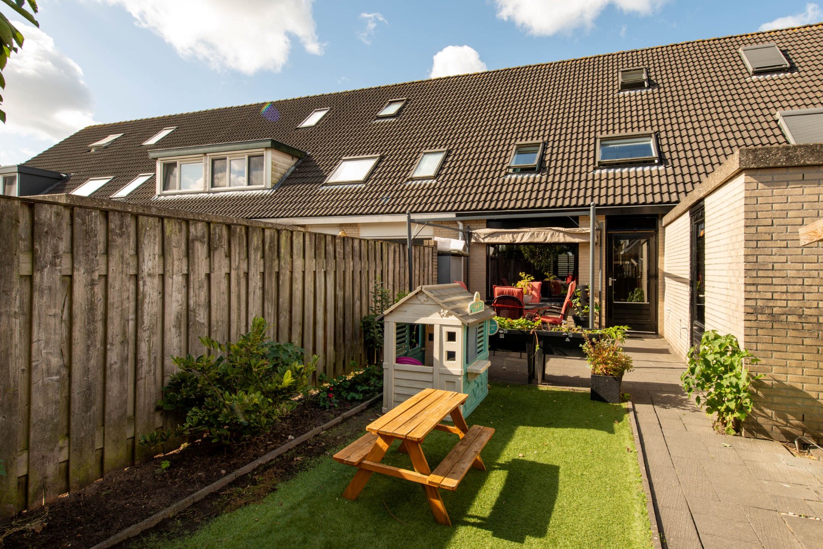 De fraai aangelegde achtertuin (ca. 13.30 x 5.50 m) is gelegen op het oosten en biedt volop privacy. Je vindt hier meerdere terrassen, kunstgras, borders met vaste beplanting, een buitenkraan en een achterom.