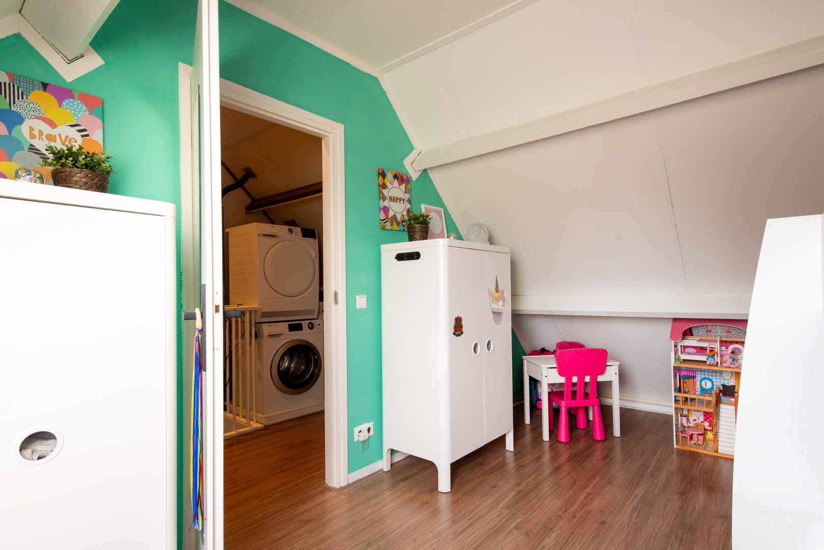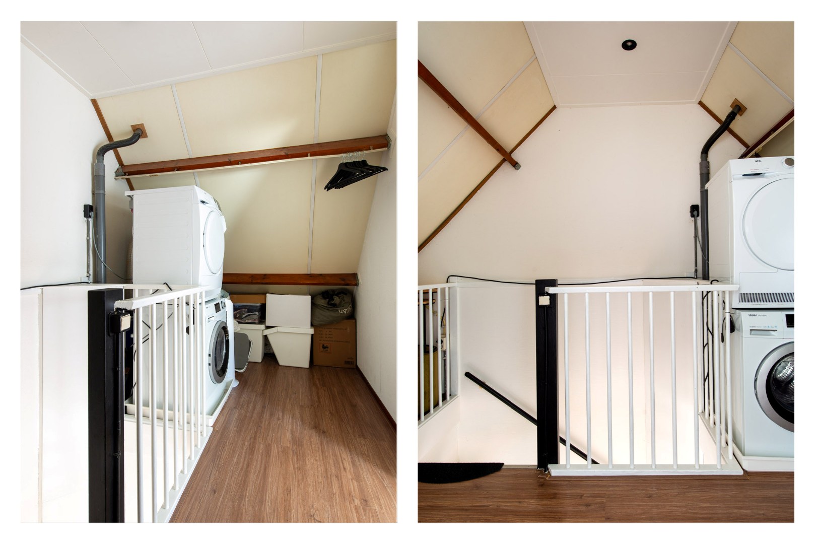 De zolderverdieping is bereikbaar via een vaste trap en biedt een ruime overloop met aansluiting voor wasapparatuur en de unit van het centraal afzuigsysteem.