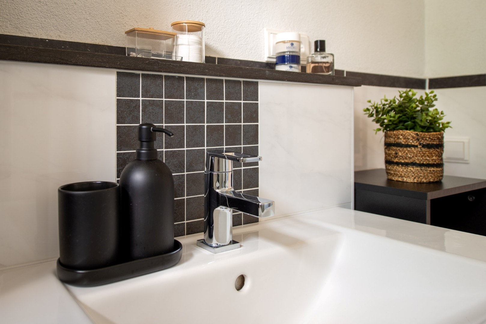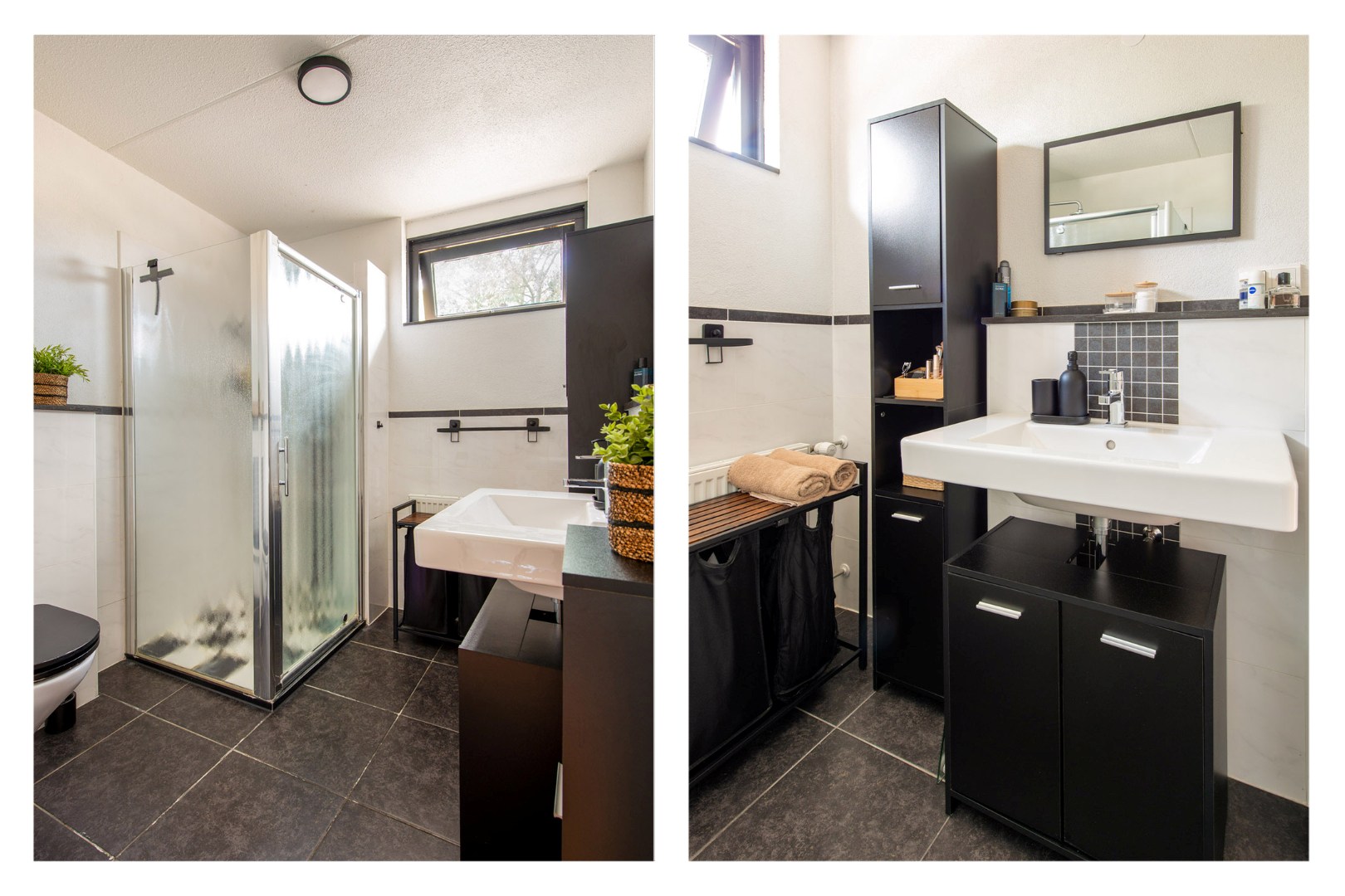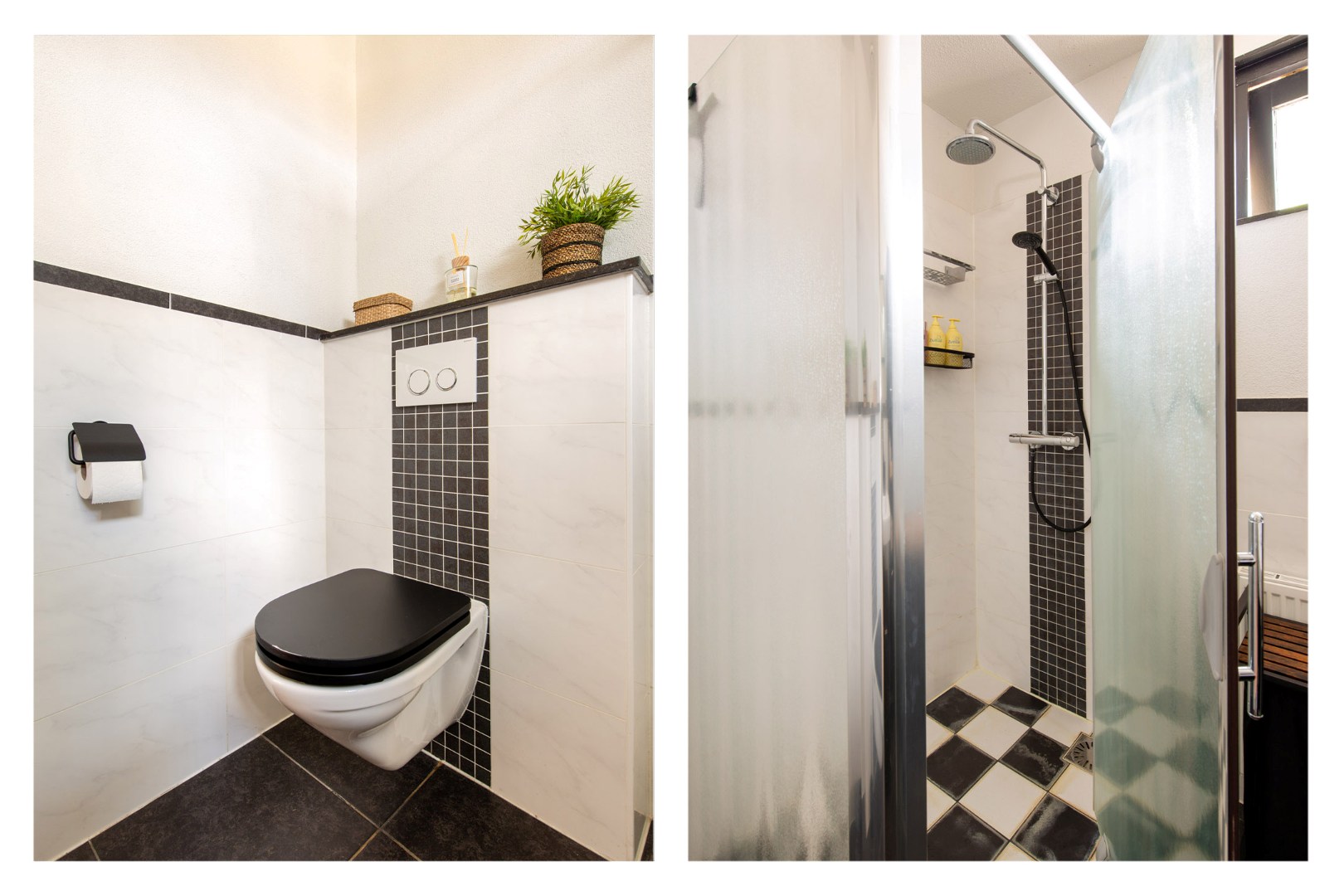 De badkamer is functioneel en modern, voorzien van een douchecabine met stort- en handdouche, wastafel met mengkraan en een zwevend toilet.