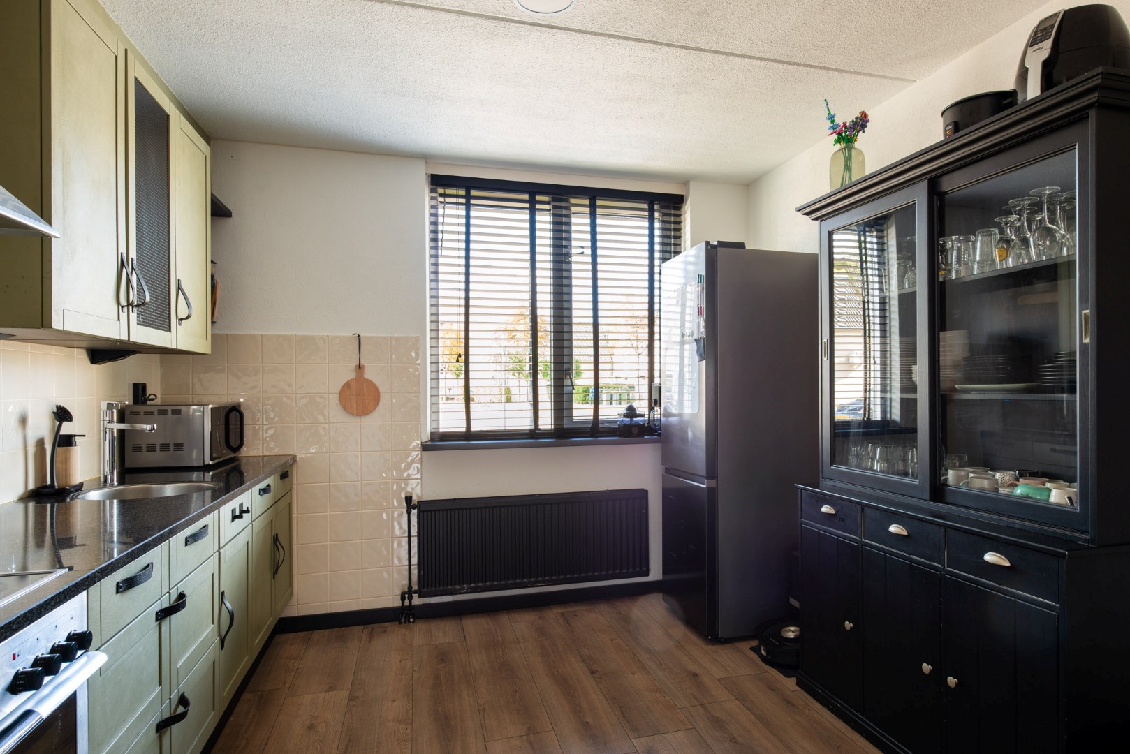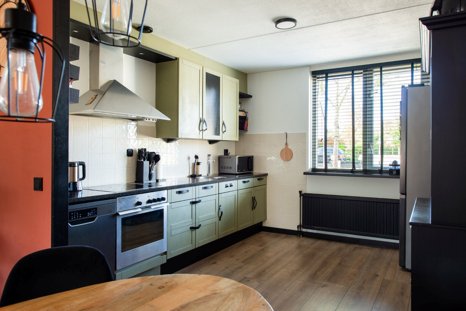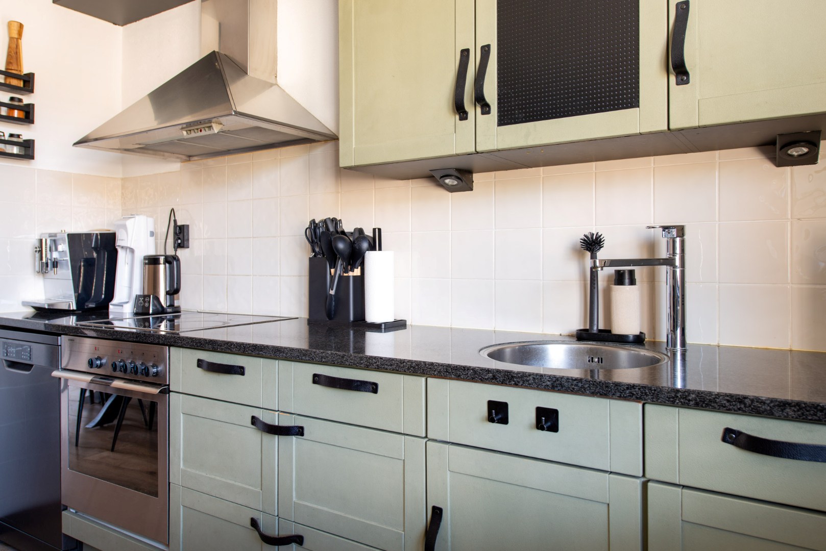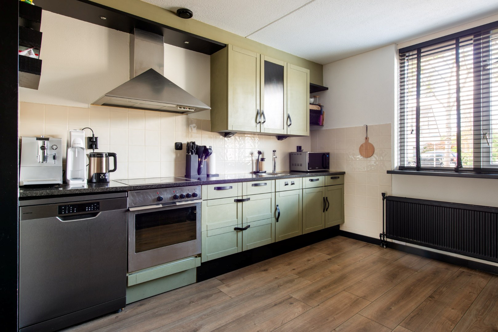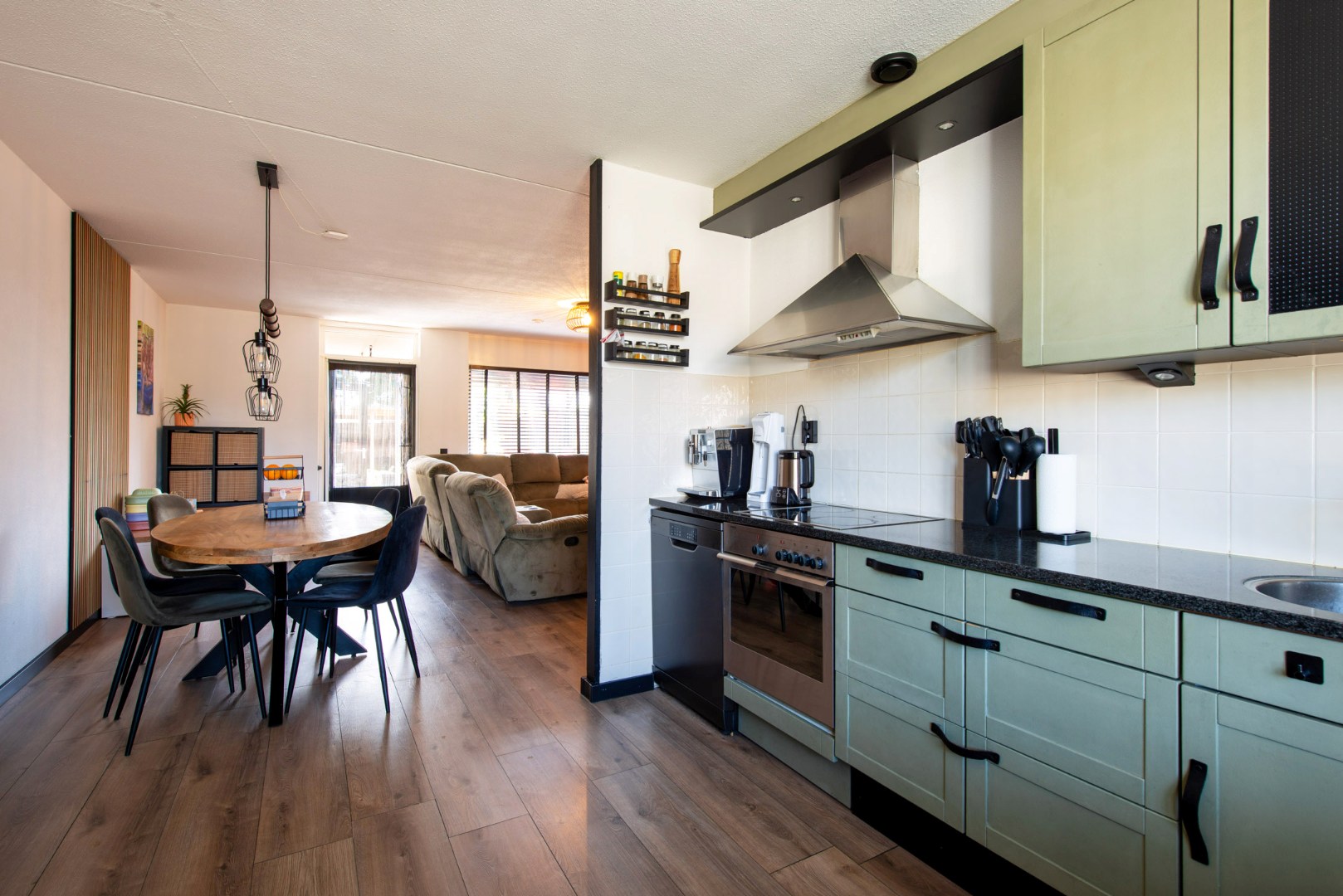 De open keuken aan de voorzijde (ca. 3.50 x 3.20 m) is volledig uitgerust met een vaatwasser, keramische kookplaat, rvs afzuigkap, koelkast, rvs spoelbak, mengkraan, diverse boven- en onderkasten, een hardstenen werkblad en sfeervolle inbouwspots.
