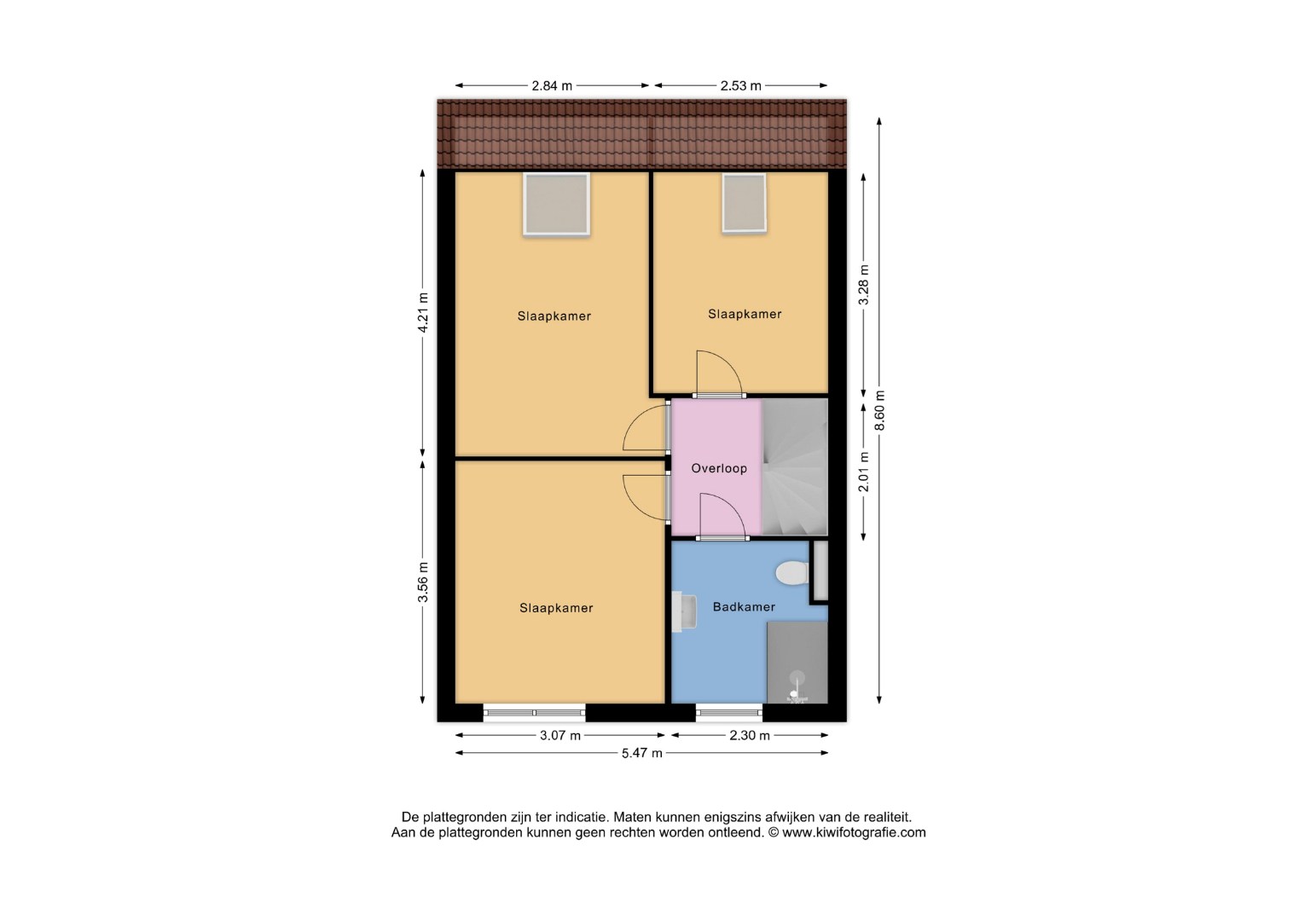 Op de eerste verdieping bevinden zich drie slaapkamers en de badkamer:
