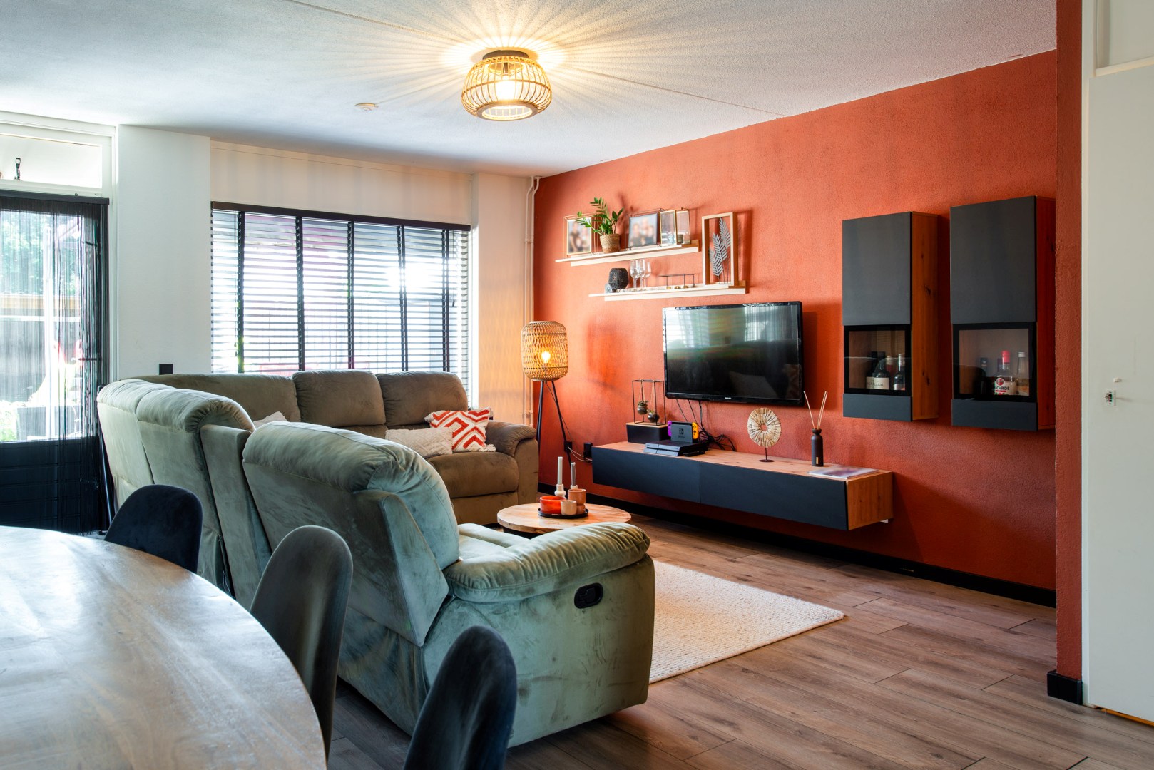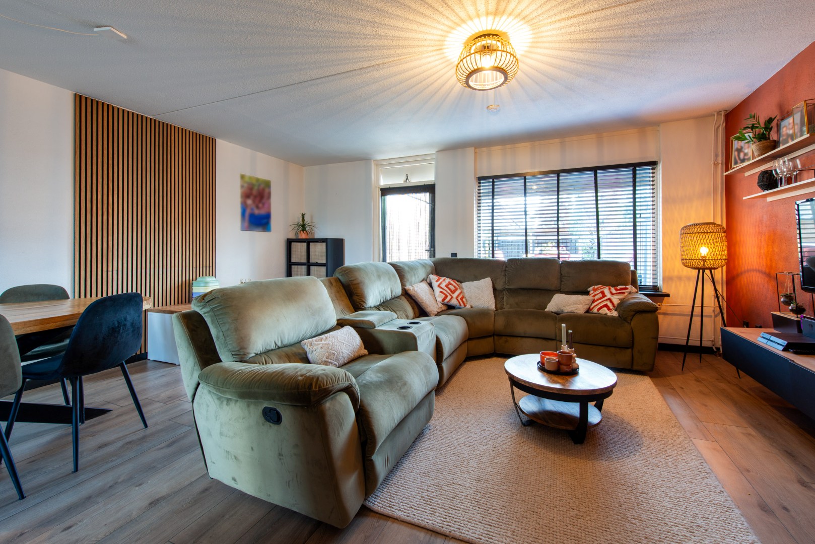 De tuingerichte woonkamer (ca. 5.10 x 5.45 m) is licht en ruim, met een praktische trapkast en toegang tot de achtertuin.