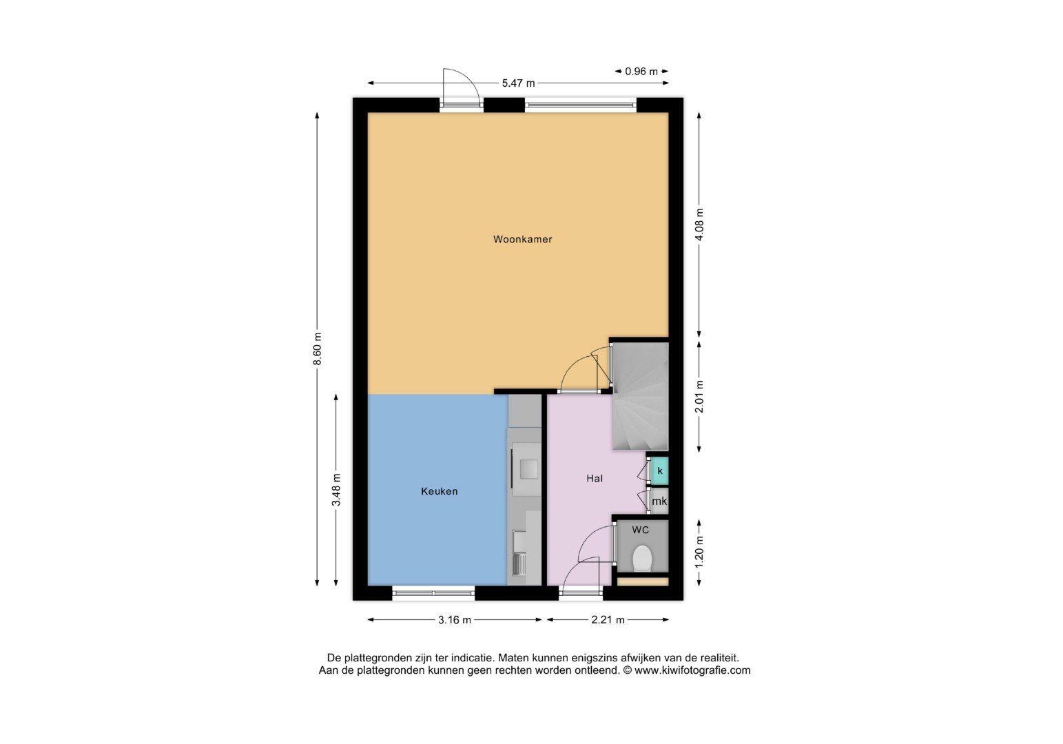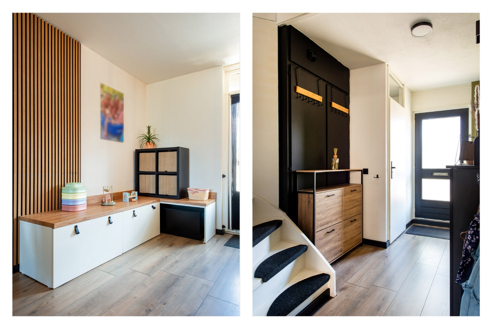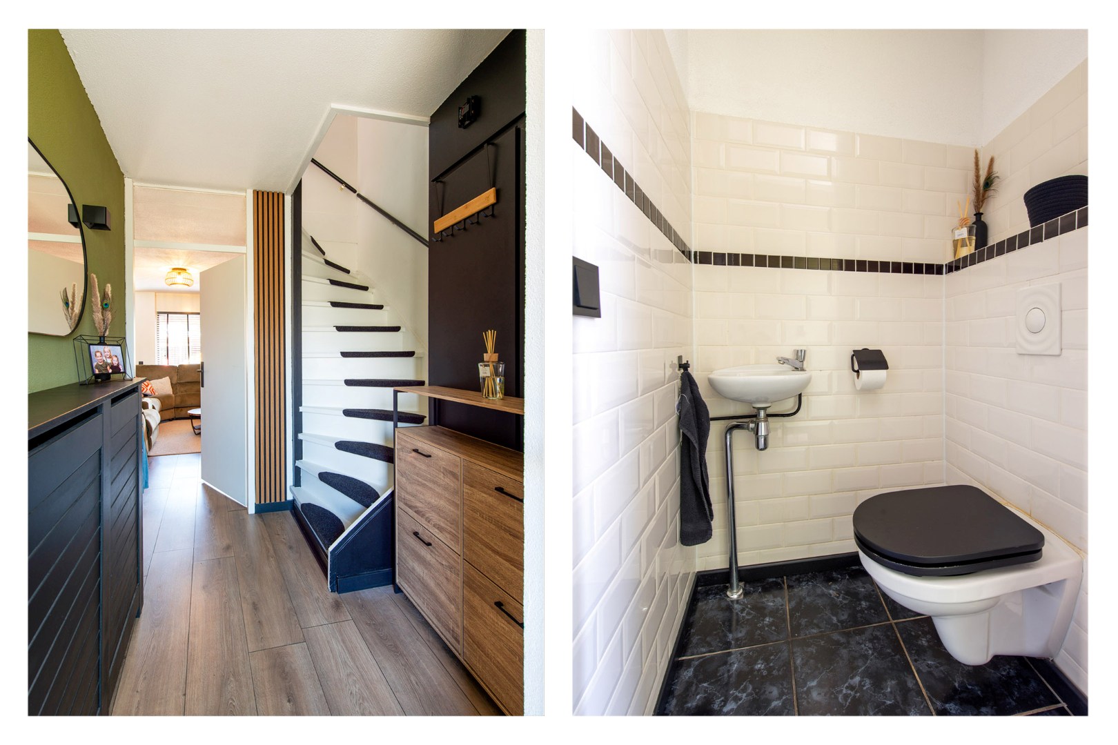 Via de overdekte entree kom je in de hal met meterkast, garderobe, kast met doorstroomapparaat, een modern toilet met fonteintje en de trap naar boven.