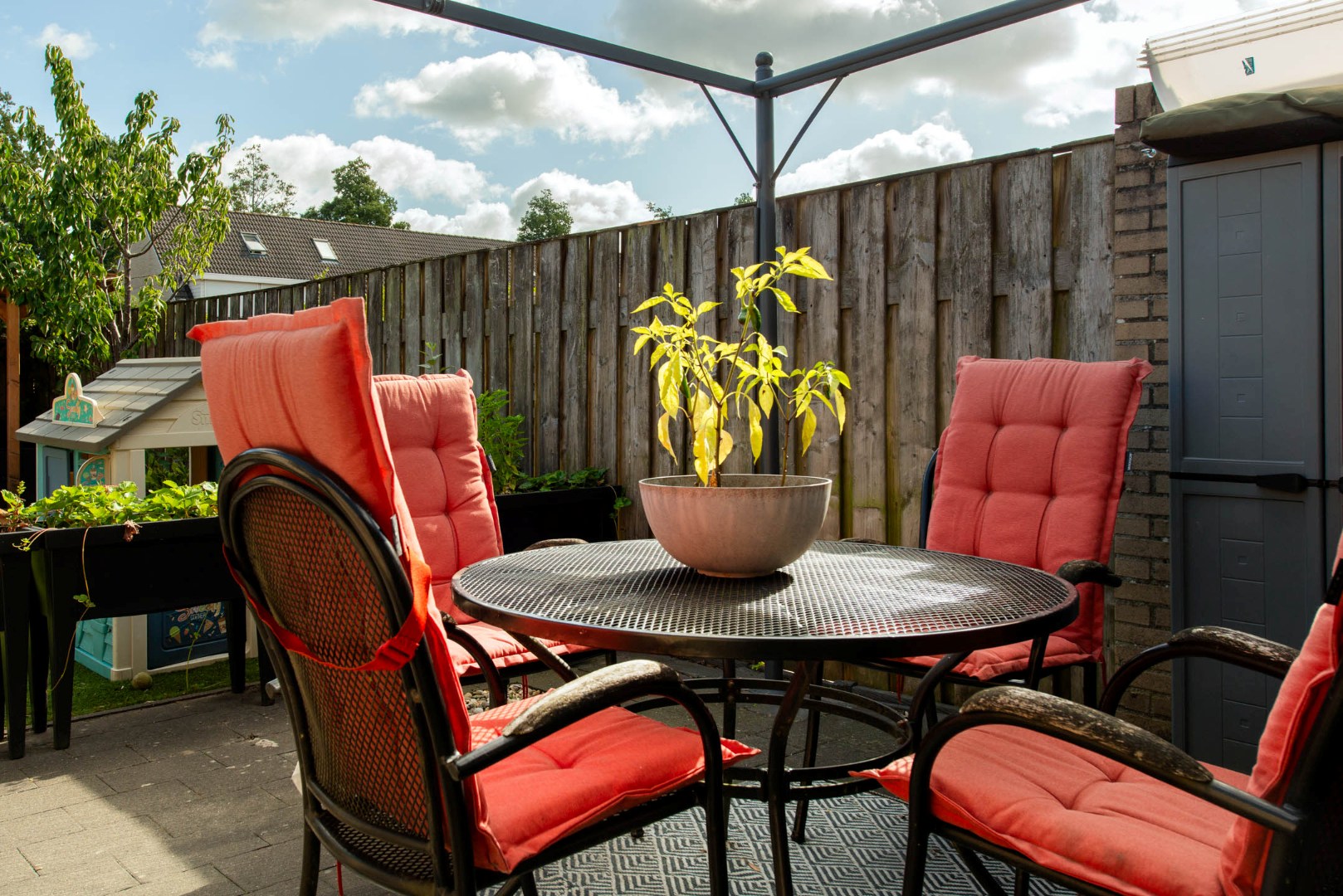 Achterin de tuin bevindt zich een vrijstaande stenen berging (ca. 2.50 x 2.40 m) met elektra.