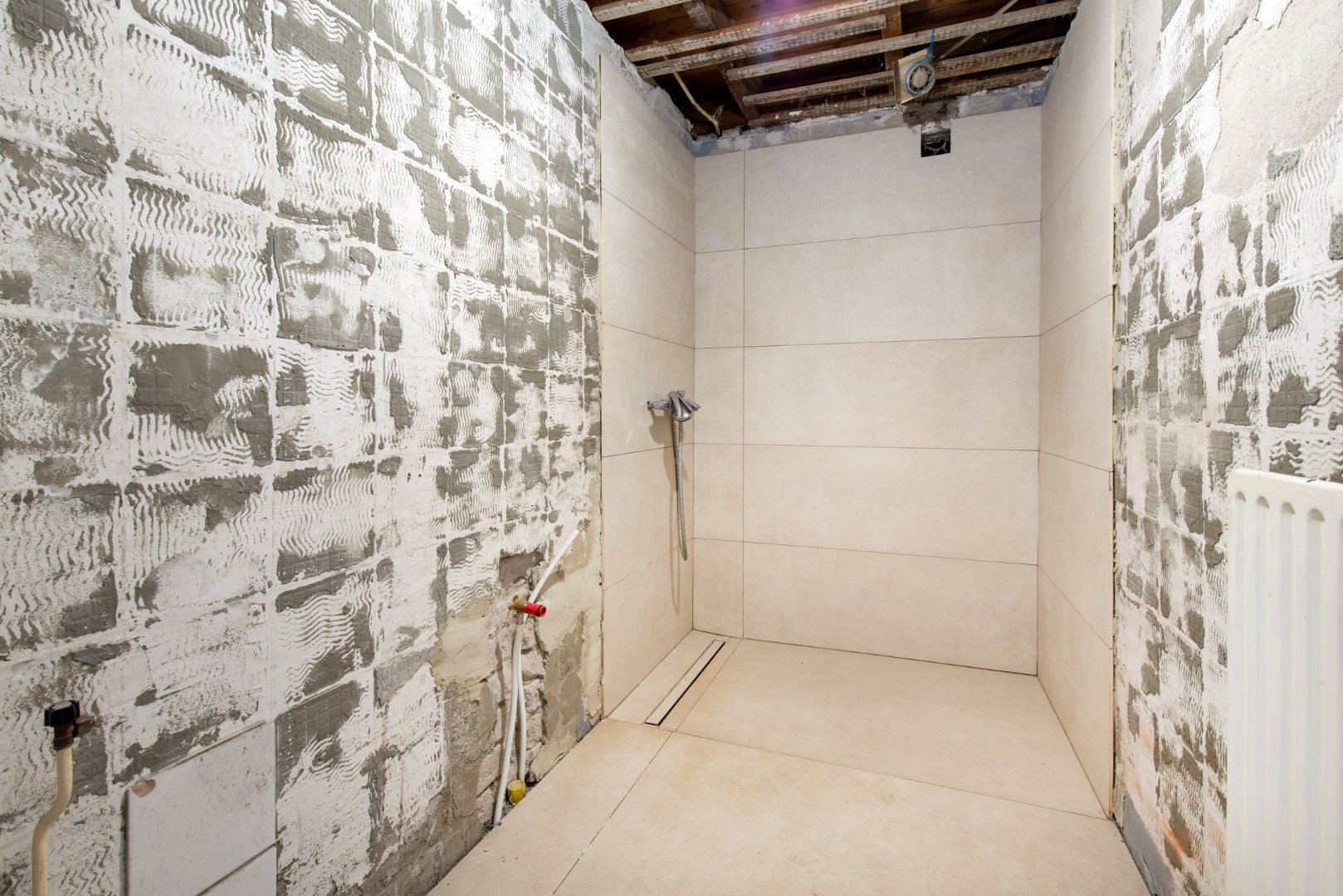 De badkamer is voorzien van een inloopdouche en aansluitingen voor toilet en wastafel.