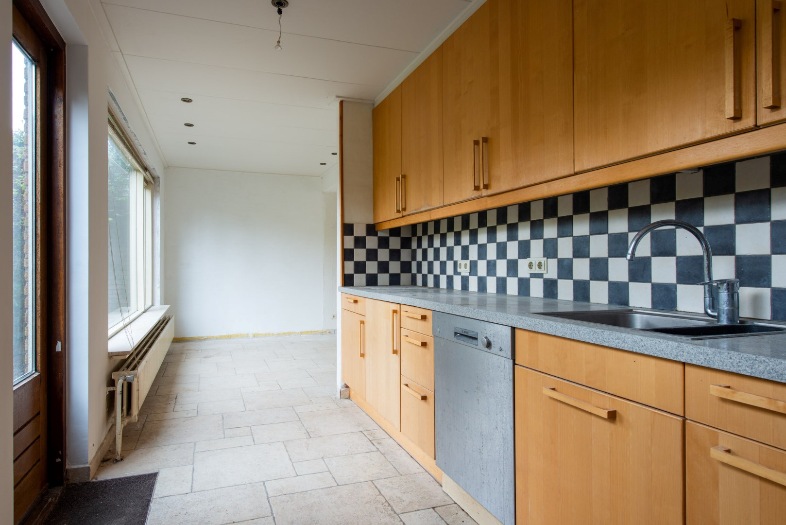 Aan het eind van de kamer vind u, verscholen achter een muurtje, de keuken. De keuken is in een rechte opstelling en is voorzien van een vaatwasser en gaskookplaat.