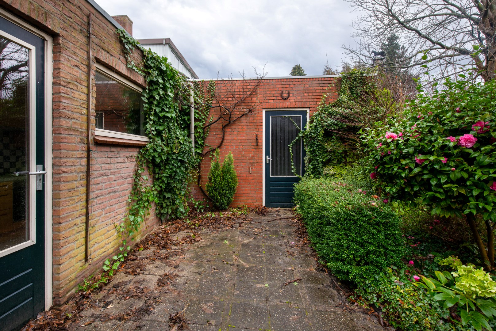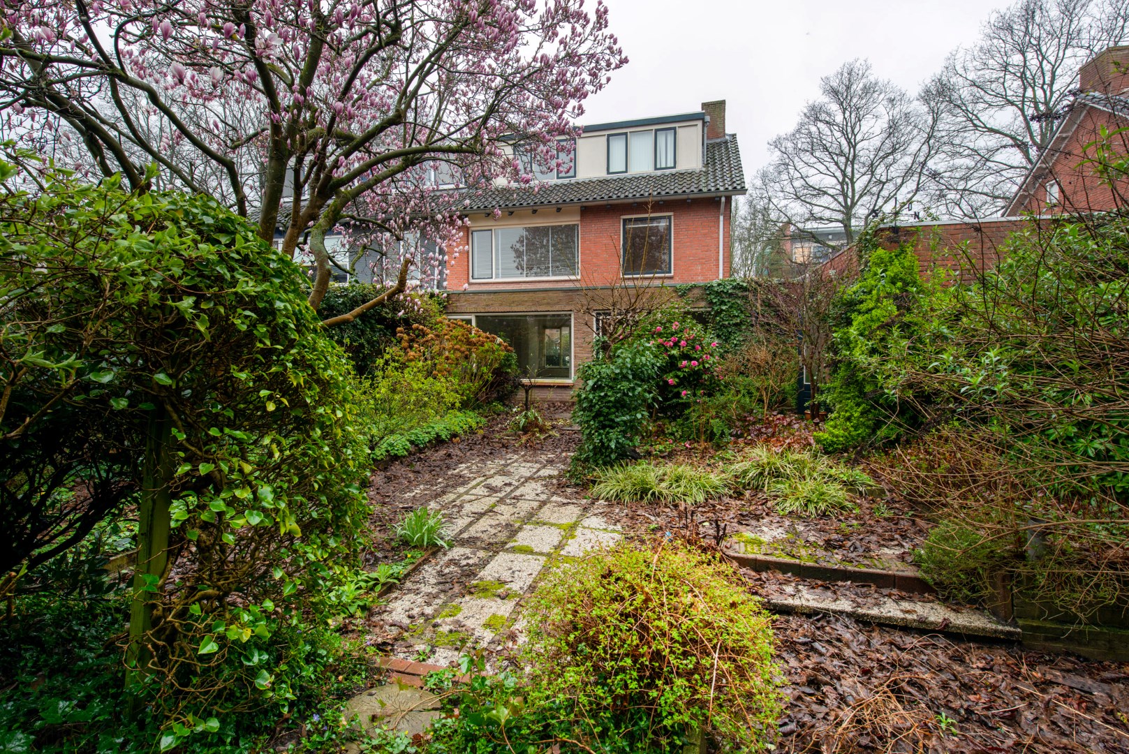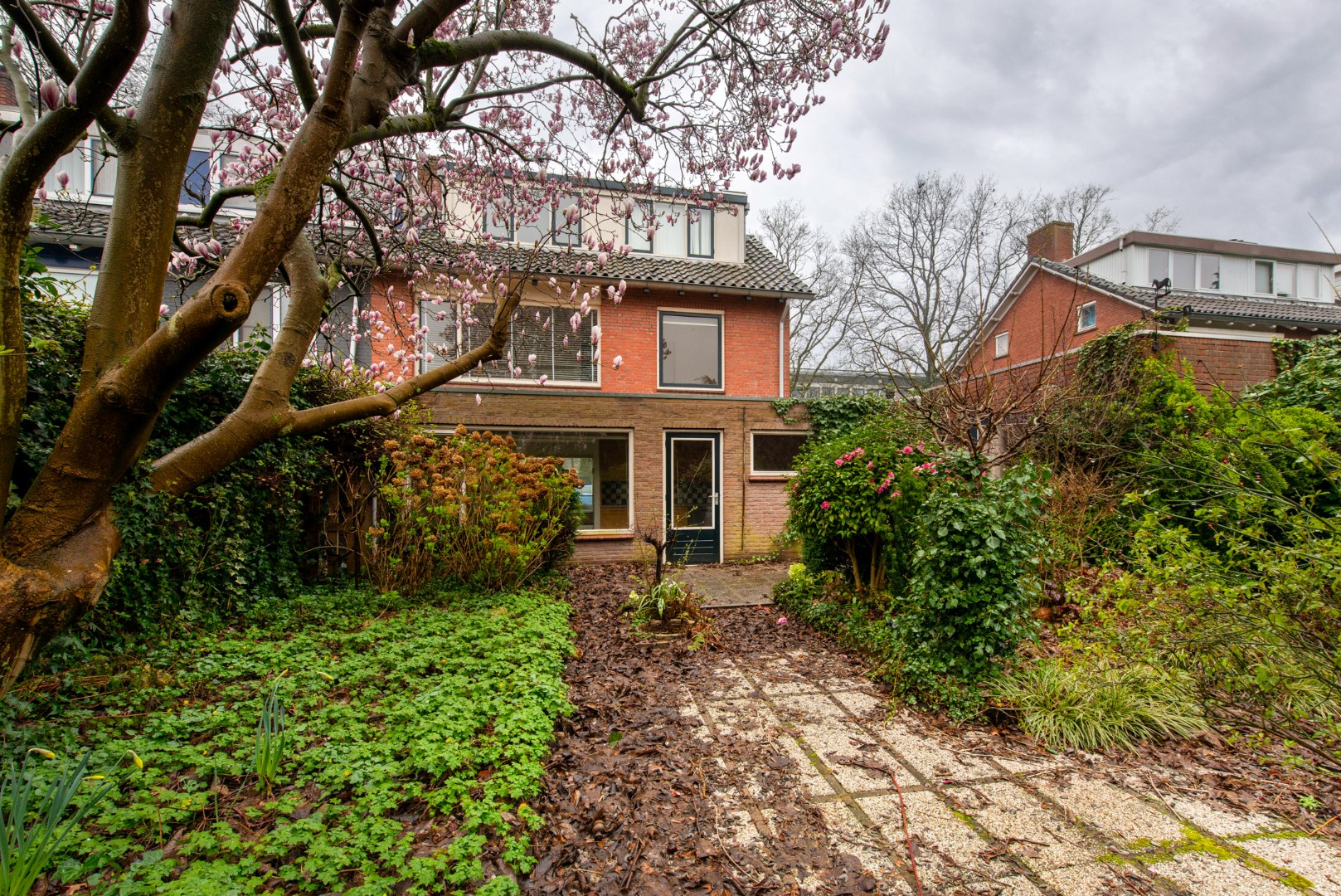 Via de keuken én via de garage komt u uit op de op het oosten gelegen diepe achtertuin welke is voorzien van verschillende terrassen en mooie perken.