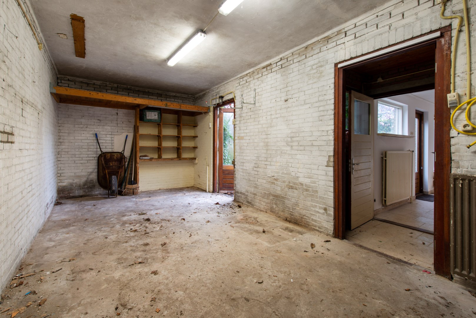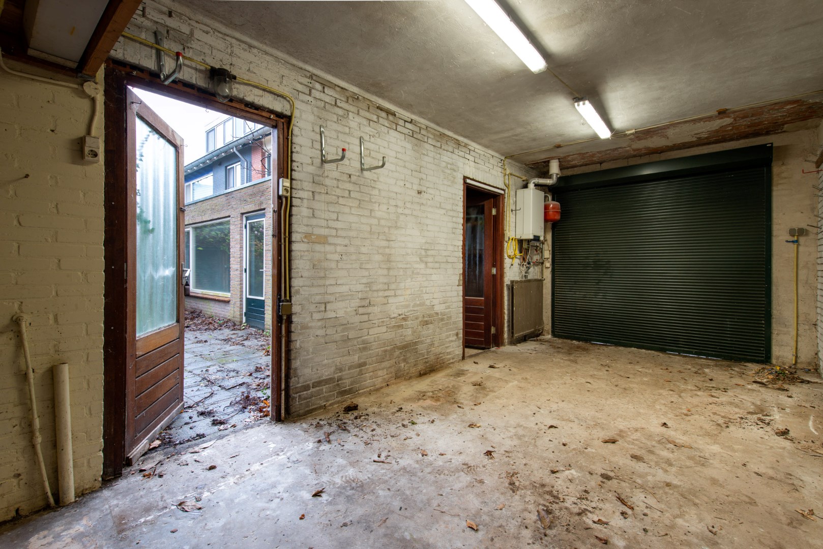 Vanuit de keuken kunt u via de bijkeuken inpandig door naar de ruime garage. Deze garage is voorzien van een elektrische deur. Hier hangt ook de cv-ketel (2011) welke in eigendom is.