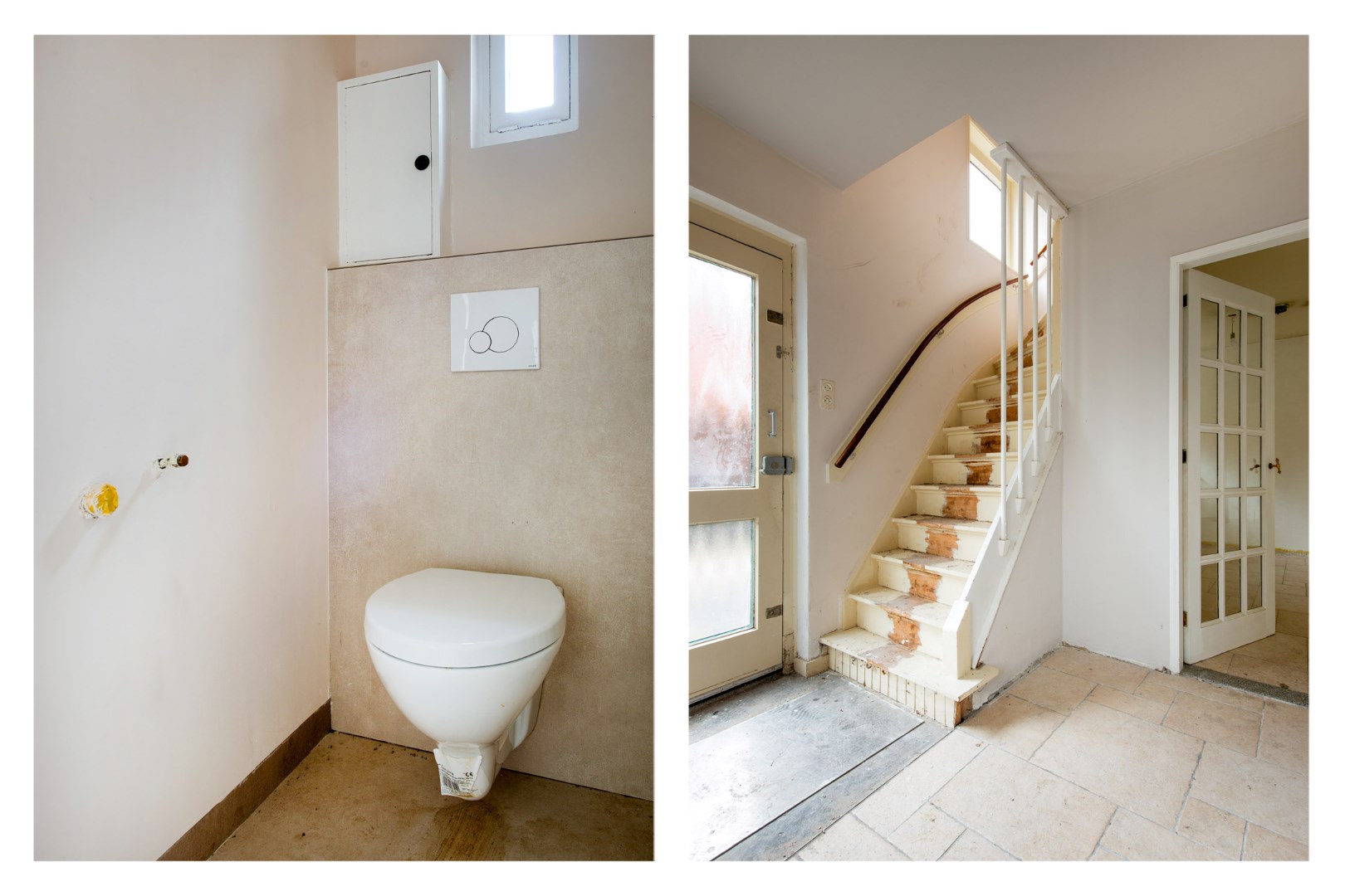 Het toilet is onlangs vervangen voor een modern hangend toilet en is voorzien van aansluiting voor wastafel.