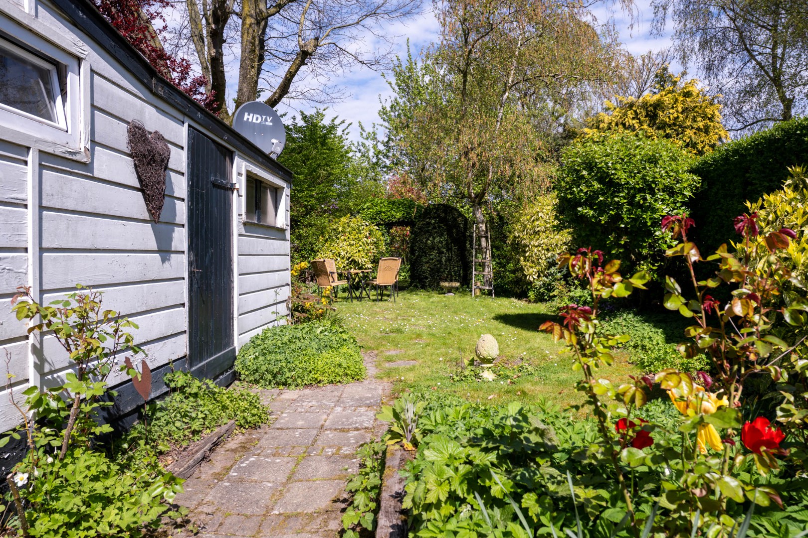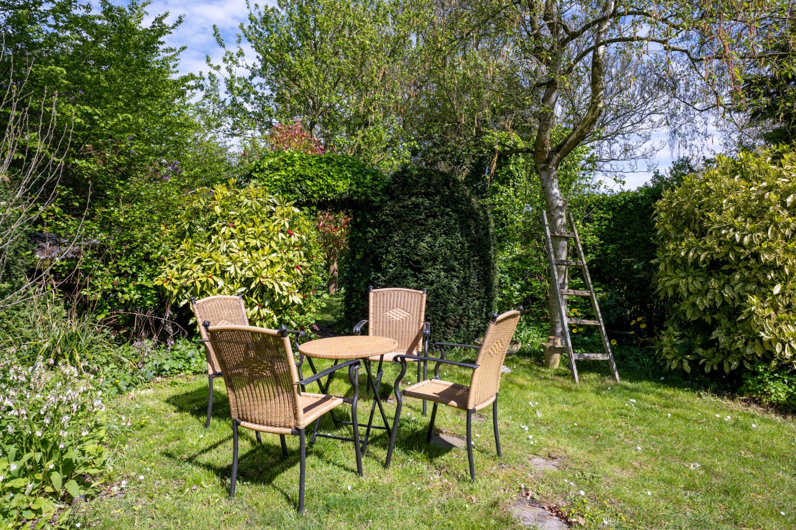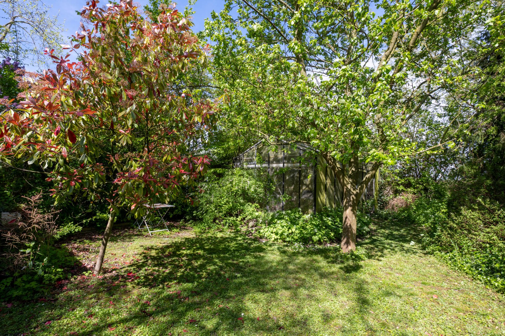 Buiten geniet je van een volwassen, fraai aangelegde tuin aan zowel de voor- als achterzijde met een grote bloemenkas, romantische hoekjes en sfeervolle zitplekken. De tuin wordt omgeven door mooie grote bomen en beschikt over een authentieke waterput, wat zorgt voor veel privacy, schaduw en een unieke groene uitstraling. Parkeren kan direct naast de woning, wat zorgt voor extra gemak.