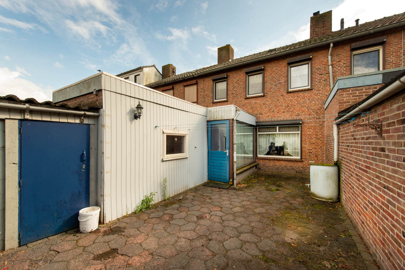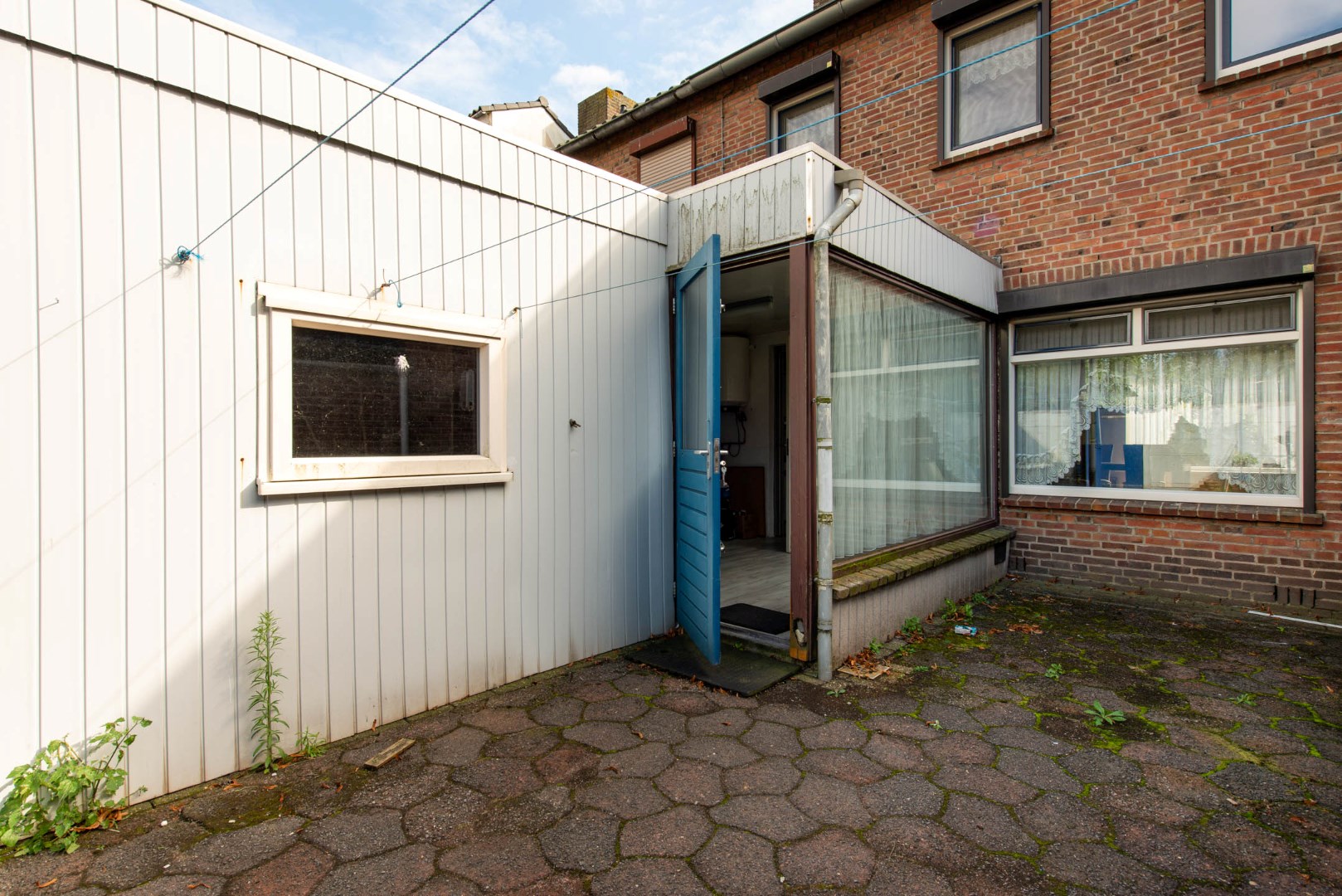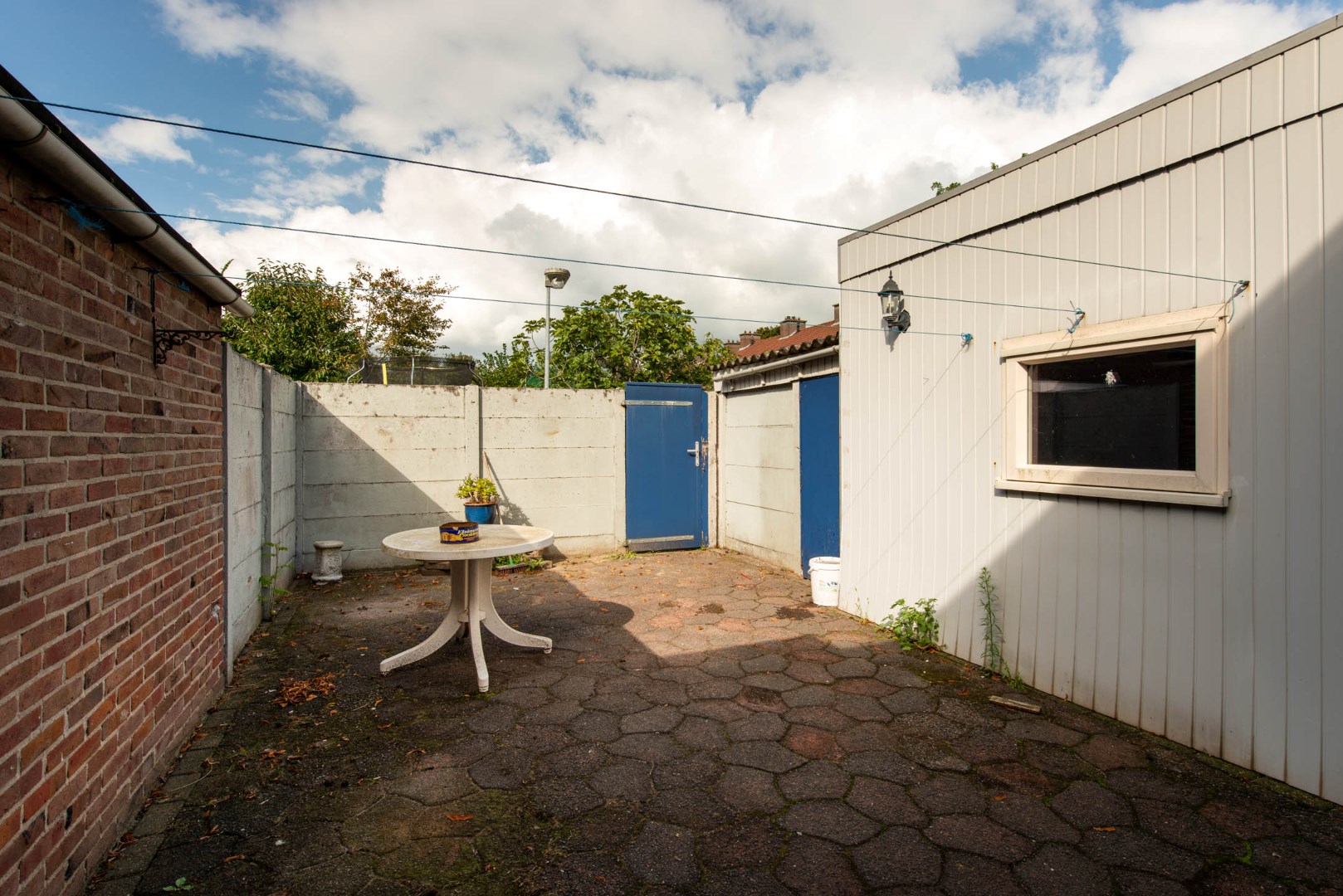 Deze is volledig betegeld en hier bevinden zich de schuur (6,8 m²) en een extra berging (5,2 m²).