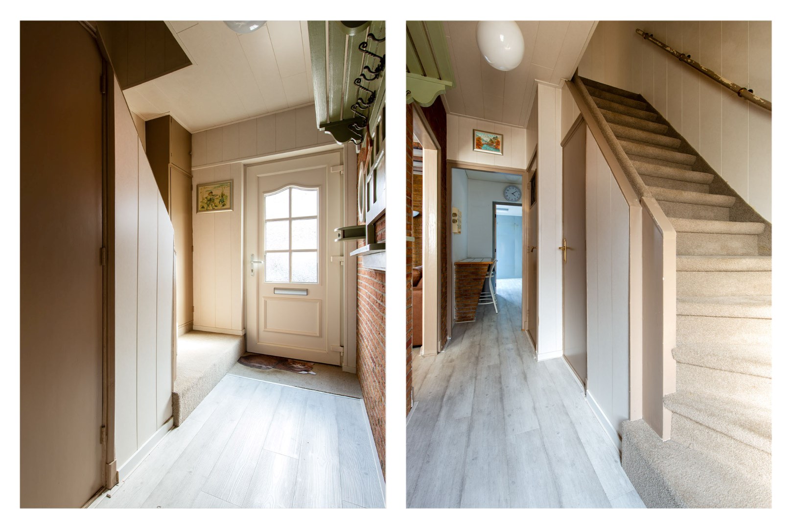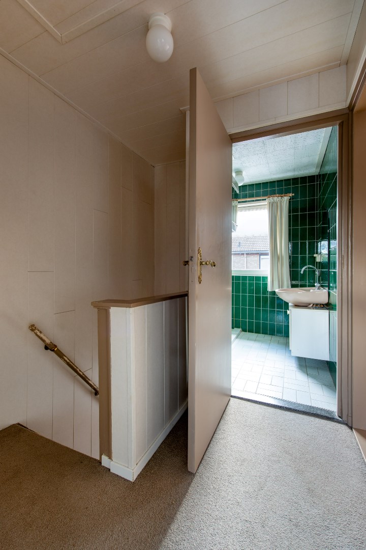 De trap naar de bovenverdieping, de kelder en het toilet.