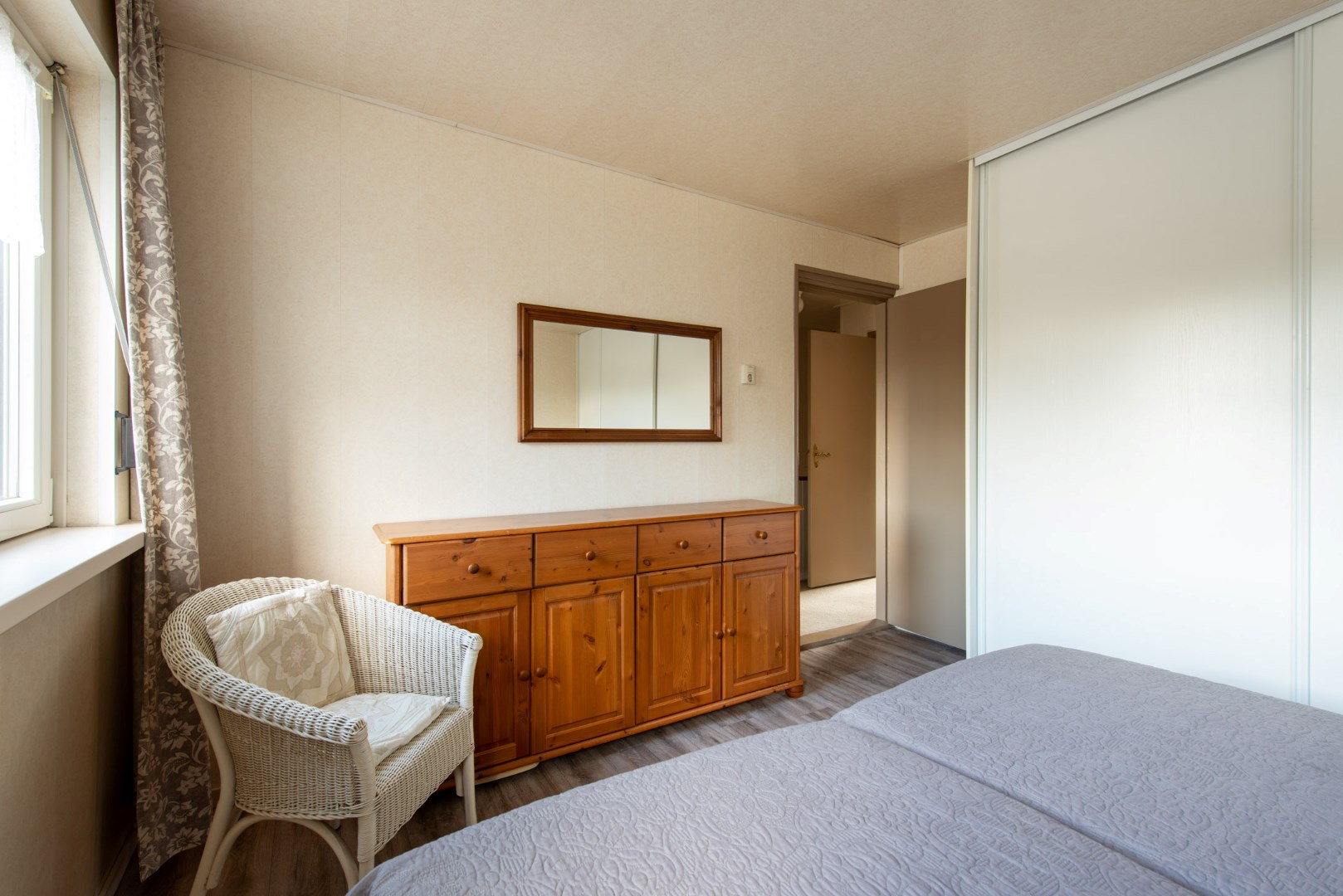 Deze slaapkamer heeft tevens een grote kast met schuifdeuren.