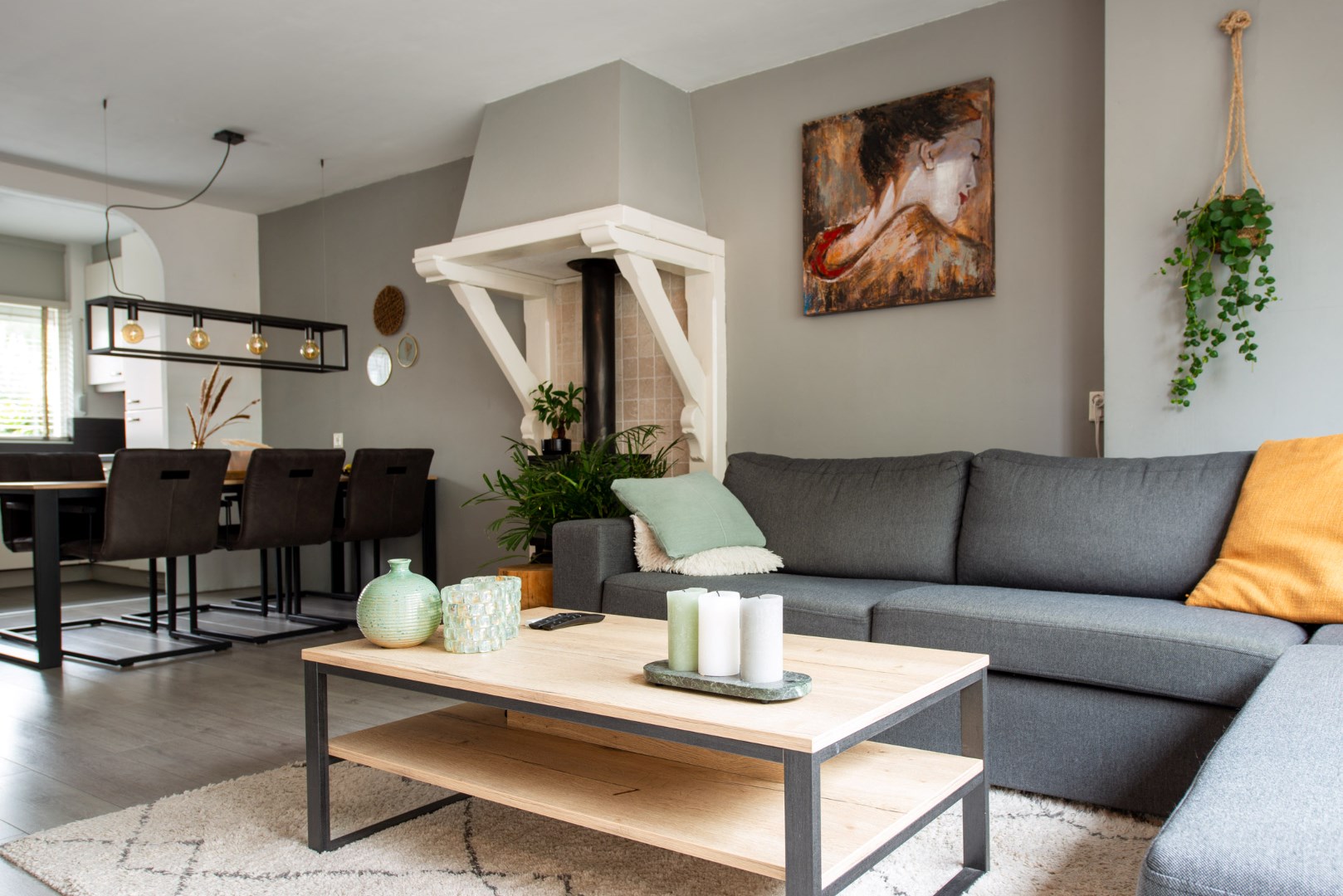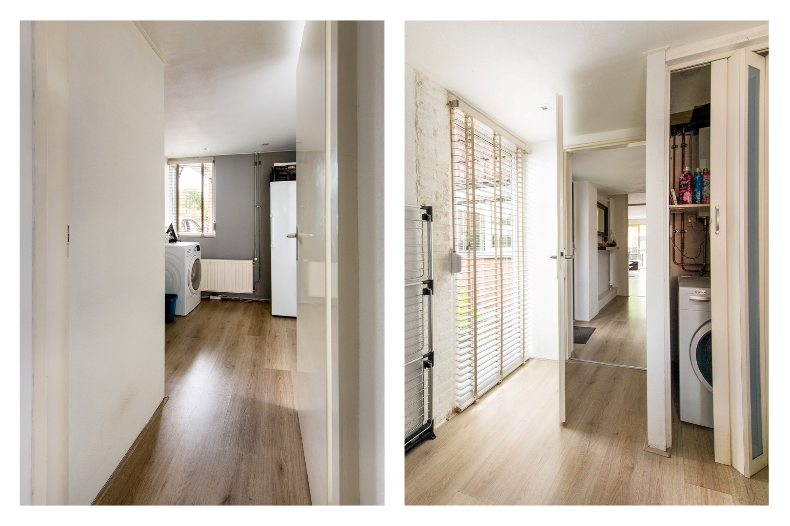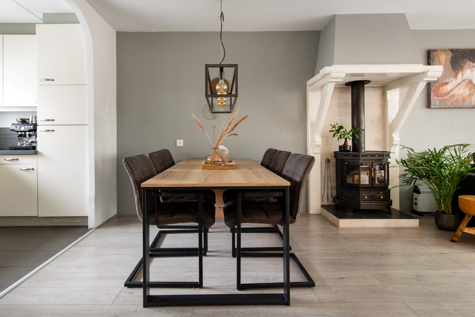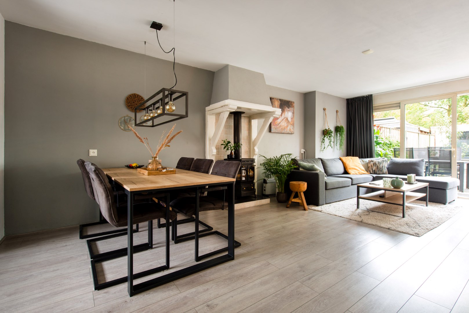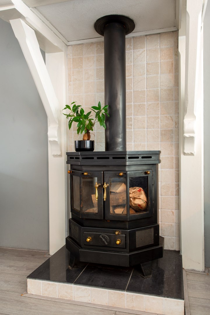 Aan de voorzijde is de nette berging met de nieuwe cv-ketel en aansluitingen voor de wasmachine en droger. Vanuit de hal/entree heeft u ook toegang tot de zonnige grote woonkamer. Deze uitgebouwde woonkamer heeft lichte stuc-wanden en een warme onverslijtbare laminaatvloer. Een romantische houtkachel zorgt voor de sfeer op koude winteravonden. Via de royale dubbele schuifdeuren komt een zee van licht de woonkamer in.