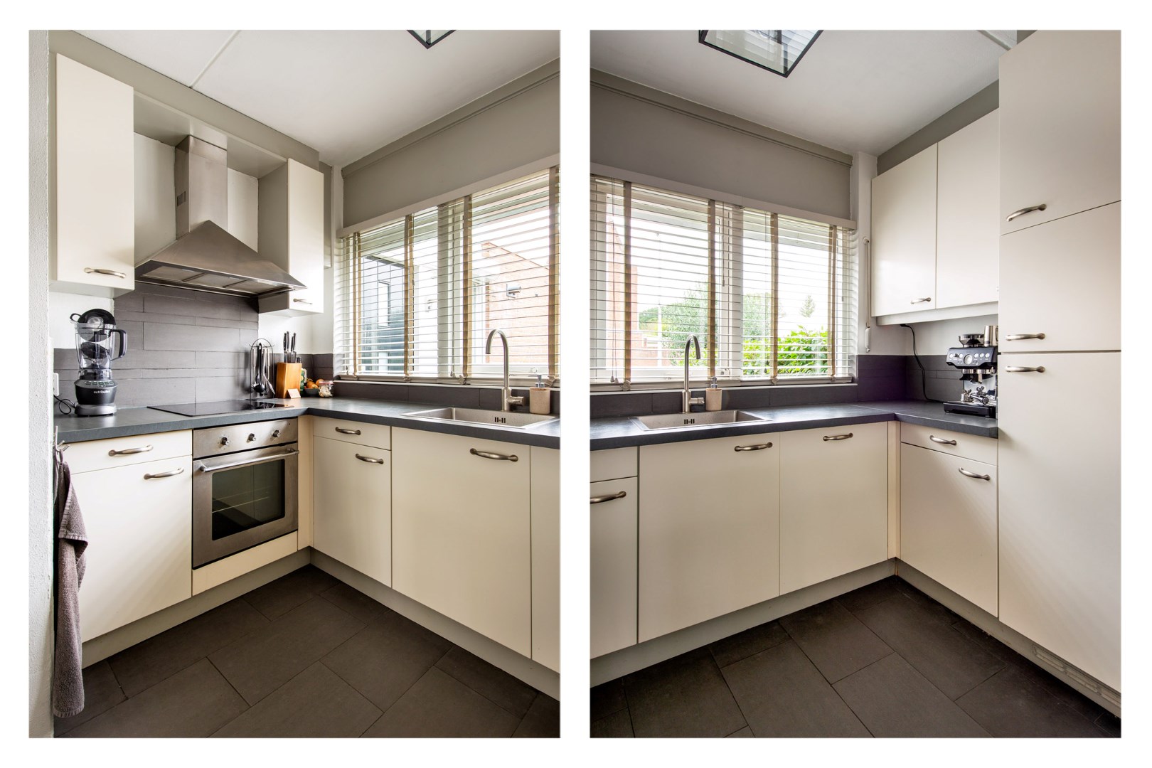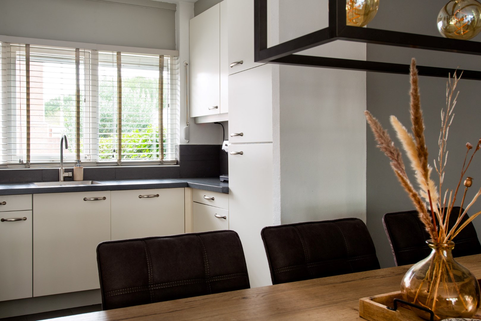 De gezellige keuken is aan de voorzijde van de woning gelegen, en ingericht met een moderne U-vorm opstelling met koelkast, inductie kookplaat, oven, vaatwasser en afzuigkap. Vanuit de keuken heeft u uitzicht op de voortuin. Het royale elektrische zonnescherm is in de zomer een welkome verlenging van uw woonplezier.