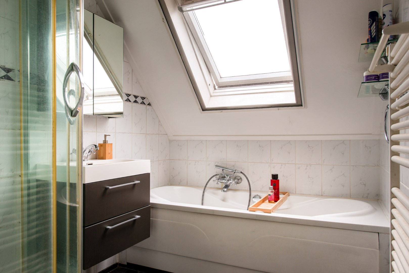 De volledig betegelde badkamer is ingericht met douchecabine, ligbad en vast wastafelmeubel. Deze badkamer dient wel opgefrist te worden.